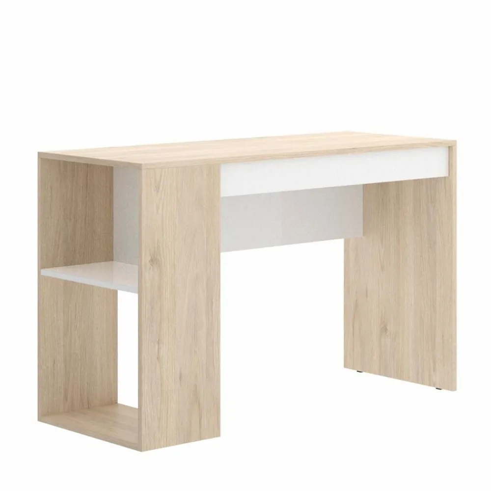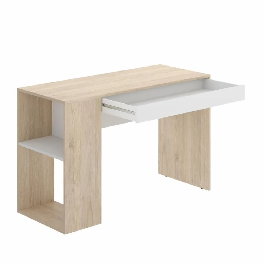 También disponible en versión blanco y grafito, al mejor precio En here, se trata de una mesa de estudio, amplia con un estante de dos baldas que hace de pata en uno de los lados y un amplio cajón debajo de la encimera. La versión en blanco se combina con el frente del cajón en grafito y la versión en color roble natural lleva el frente del cajón en blanco.