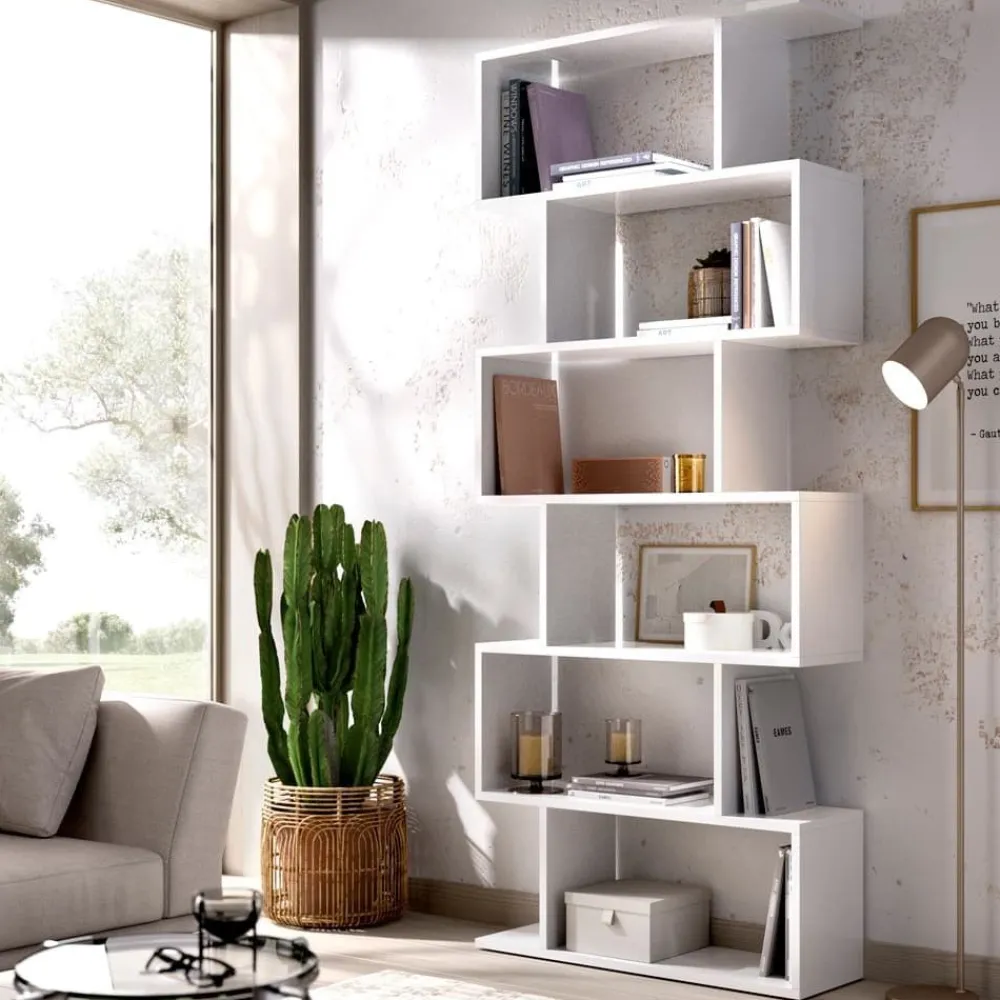 La estantería de pie alta Lis, con un bonito diseño en color blanco brillo, nos ayuda a mantener el orden en nuestro salón o dormitorio. Una estantería en forma zig-zag que será protagonista de la pared en que vaya instalada. Utilízala para colocar libros u objetos decorativos.