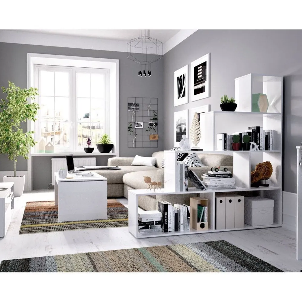 La estantería Ten en color blanco Brillo es muy bonita y perfecta para colocar como separación de dos ambientes diferentes, su diseño en forma escalonada aporta un toque de modernidad a tu salón o dormitorio. La estantería para libros u objetos decorativos Ten está realizada en tablero de partículas de primera calidad revestido de melamina en color blanco brillo.