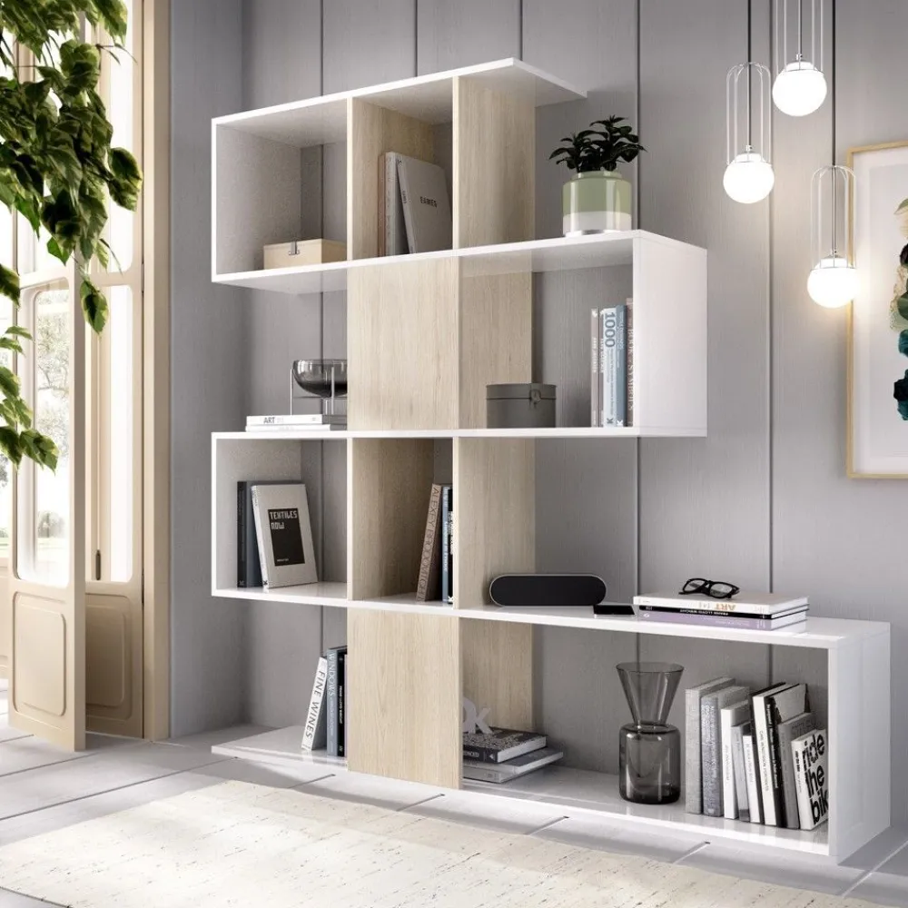 Una estantería con un divertido diseño en forma zigzag, así es la librería Funk, queda muy bien integrada en cualquier ambiente gracias a su acabado en color blanco brillo y roble natural