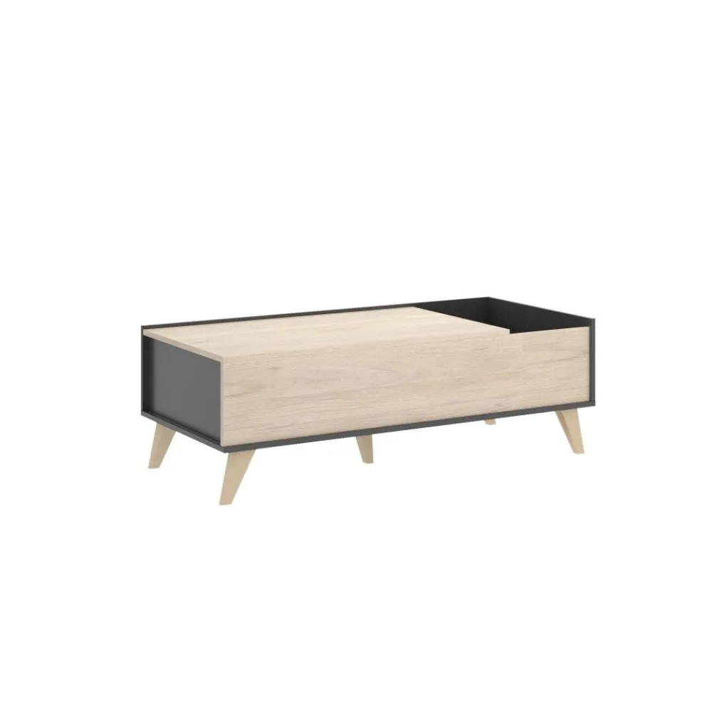 Esta bonita mesa de centro no tiene nada que ver con las que solemos ver, se trata de una mesa elevable que en el armazón combina los dos colores con los que está fabricada, el roble natural y el grafito, tiene 4 patas en color madera roble natural vistas y en forma triangular que son muy decorativas, el cuerpo de la mesa esta dividido en dos partes, una sin encimera o lo que es lo mismo un hueco para guardar revistas, libros o lo que creas conveniente y la otra parte que es donde va la tapa que se eleva. Esta tapa elevable nos deja un cajón oculto en el que podemos guardar los mandos a distancia, los mandos de la consola o todo aquello que no queramos que se vea en el salón cuando hay visita.