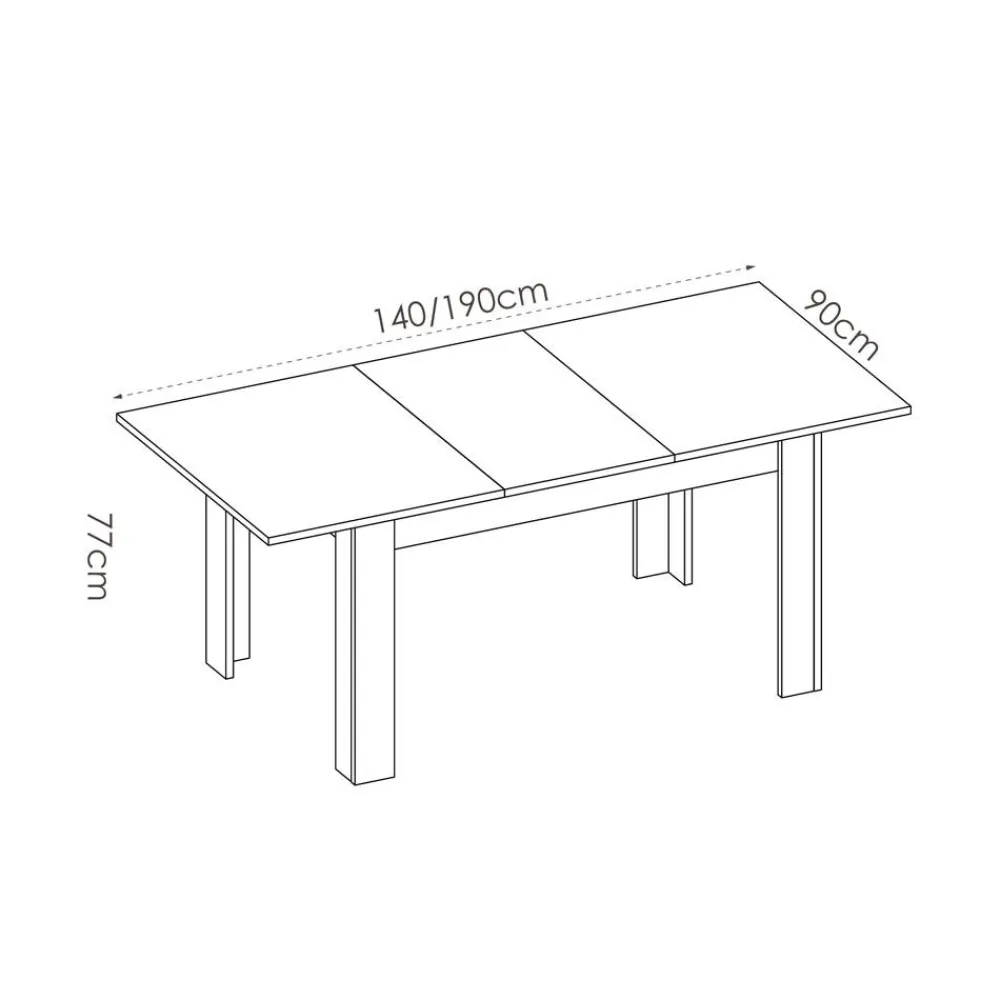 - Mesa de salón extensible: 140 cm (cerrada) – 190 cm (abierta) x 77 cm (alto) x 90 cm (fondo).