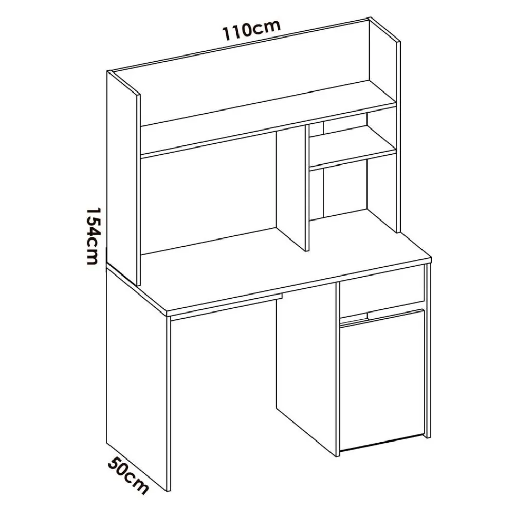 Está equipada con un cajón y una puerta que alberga dos espacios interiores separados por un estante, esta mesa proporciona un almacenamiento organizado. Además, el altillo sobre la encimera ofrece tres espacios adicionales para libros, material de oficina o elementos decorativos, manteniendo todo al alcance de la mano.