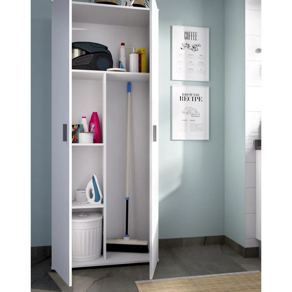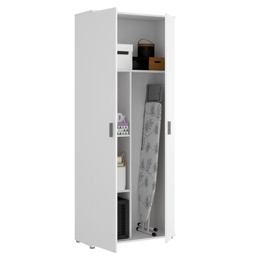 El armario escobero Fit de dos puertas, es un mueble con gran versatilidad, multiusos, con patas regulables anti humedad que nos permite colocarlo en cualquier lugar de la casa. Con una distribución interior divida en dos partes que nos permite guardar escobas, cubos e incluso la tabla de planchar