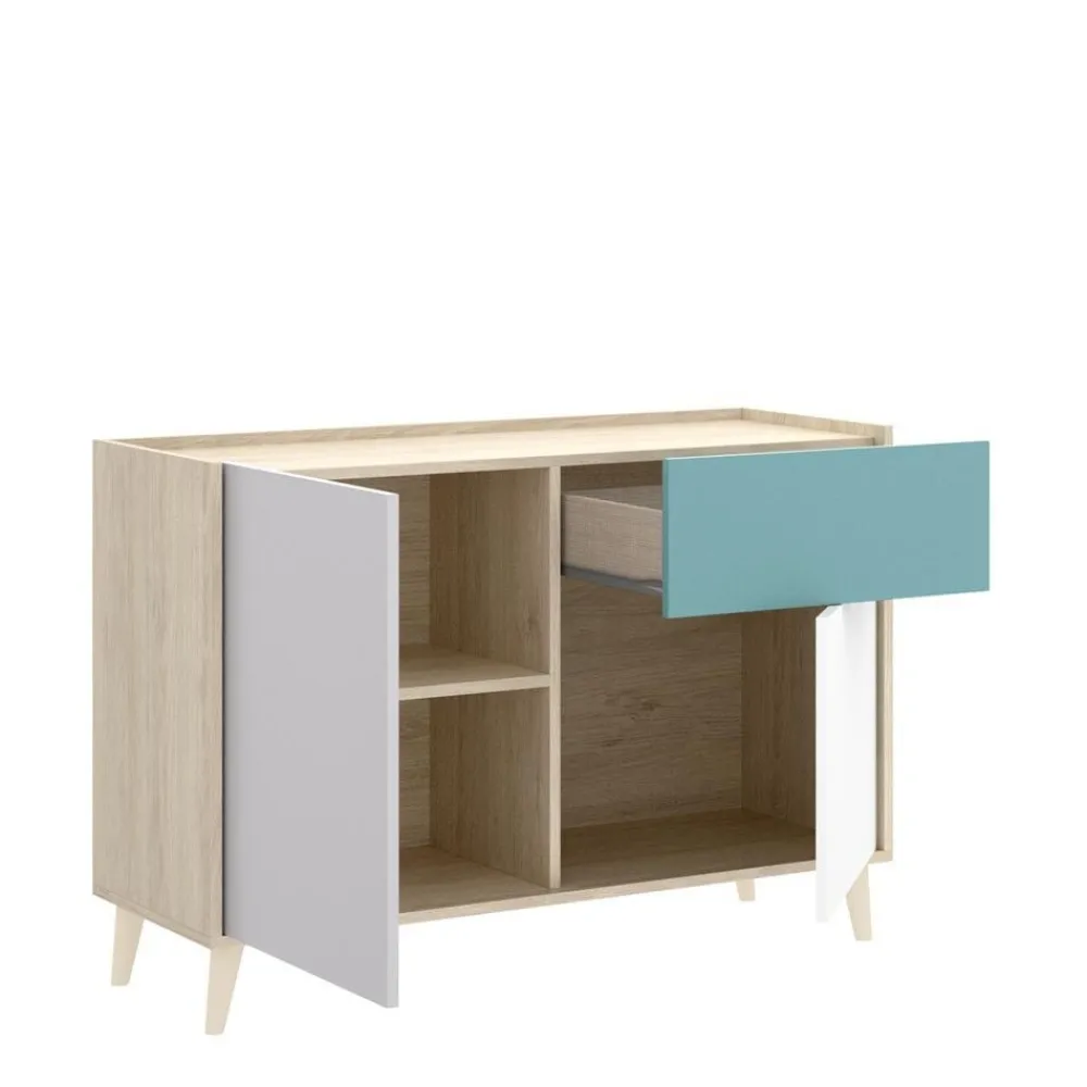 Mueble aparador de diseño atractivo con tres puertas, acabado de colores combinados, natural, gris, esmeralda y blanco. Perfecto para cualquier rincón de la casa en el que precises de un mueble para ampliar la capacidad de almacenamiento. Combina con los muebles de la serie Nova