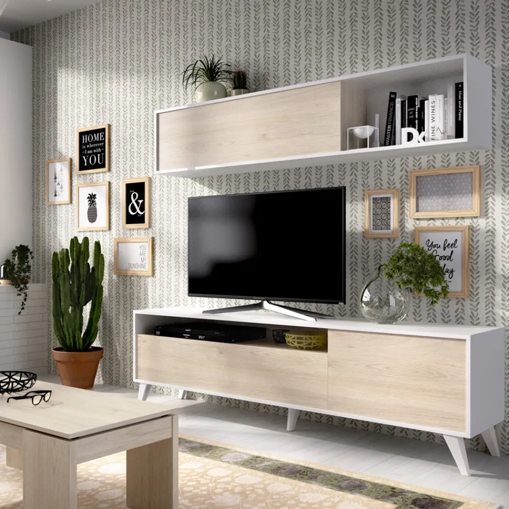 Mueble de salón compacto para espacios reducidos, en elegante blanco combinado con roble natural. Ideal para salones de tamaño medio, ofrece amplio almacenamiento y espacio para una televisión de hasta 75″.