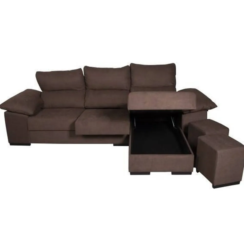 Sofá chaiselongue con arcón y 2 poufs en color chocolate