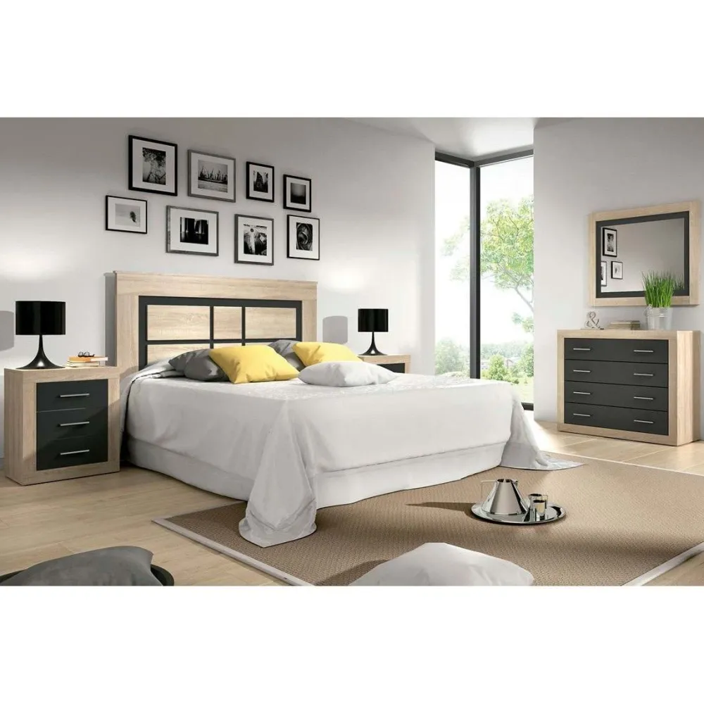 El cabezal de cama tiene un ancho de 160 cm, lo puedes acompañar con camas de 135 cm y 150 cm sin ningún problema. Este cabecero presenta un diseño moderno, estructura enmarcada y decorada con seis plafones en relieve y separados entre sí por unas franjas en el color de los frentes de cajón de las mesitas de noche.