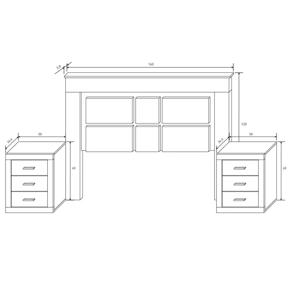 - Cabecero de cama: 160 cm (ancho) x 120 cm (alto) x 3.8 cm (fondo)
