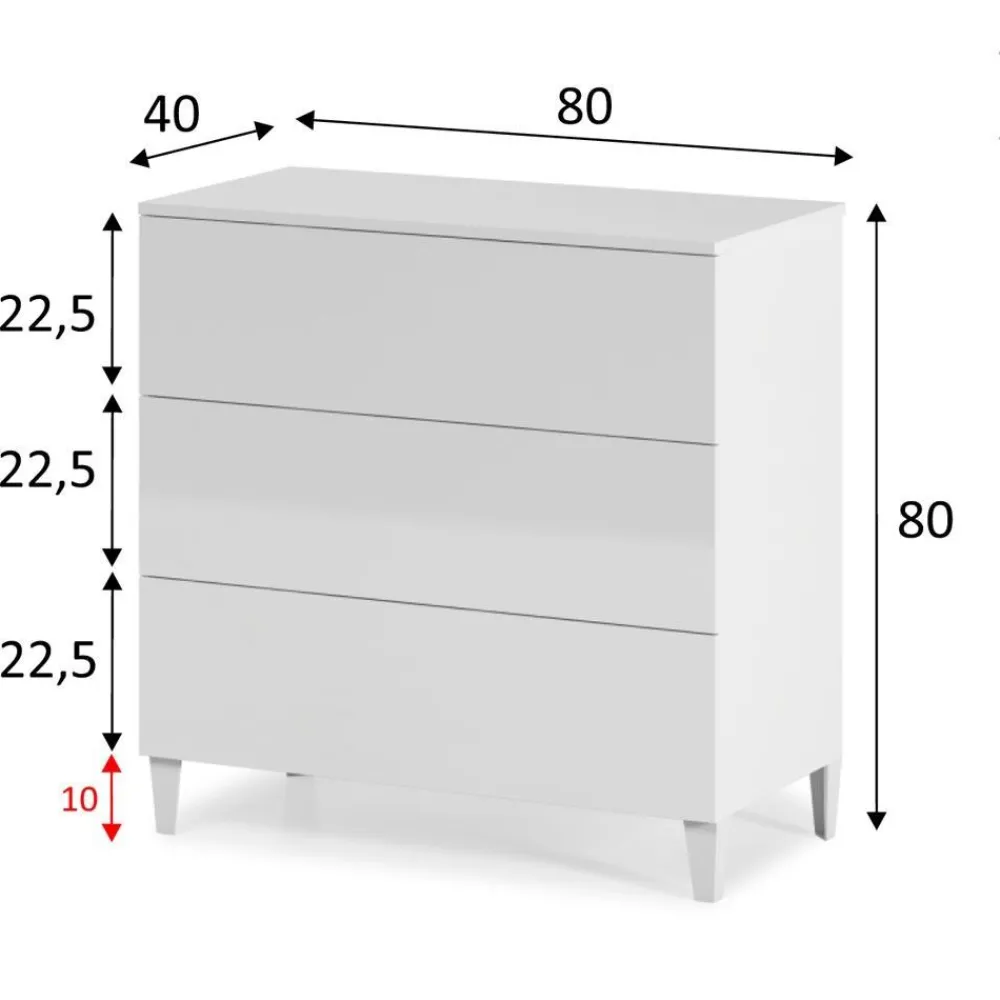 Cómoda para dormitorio Loft, en color blanco brillo, con patas de 10 cm y 3 cajones sin tiradores.