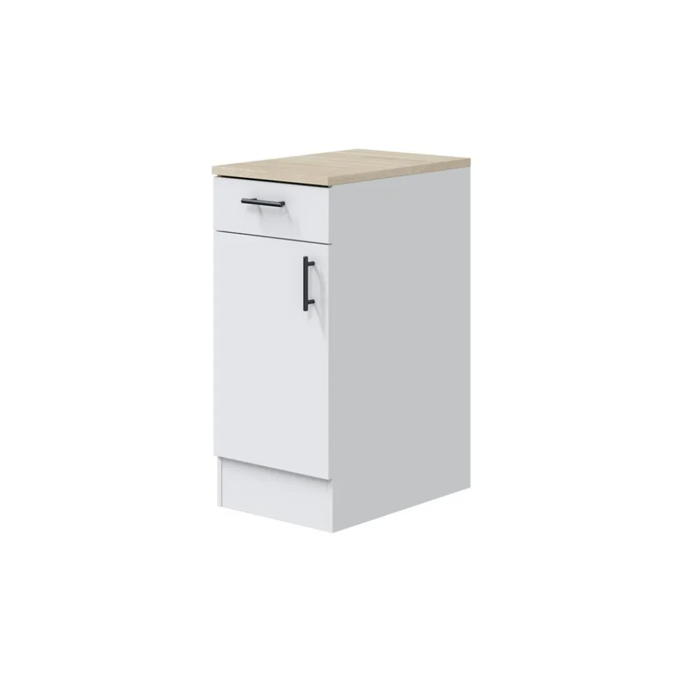Otro módulo de almacenamiento para la zona de fregadero, que ofrece un compartimento adicional para organizar utensilios, productos de limpieza o incluso artículos de uso ocasional. Con su puerta reversible y estante ajustable, es completamente adaptable a diferentes necesidades de almacenamiento.