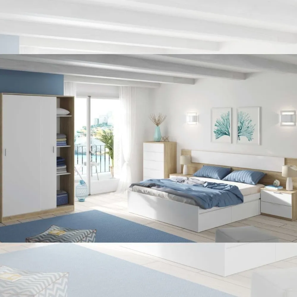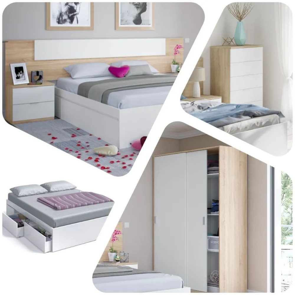 ¡Eleva tu dormitorio a un nuevo nivel de diseño con la oferta de dormitorio completo Alaya, que incluye un cabecero de cama, dos mesillas de noche, un sinfonier de 5 cajones, un armario con dos puertas correderas y una cama de cuatro cajones. Diseño minimalista en color blanco Artik combinado con roble Canadian.
