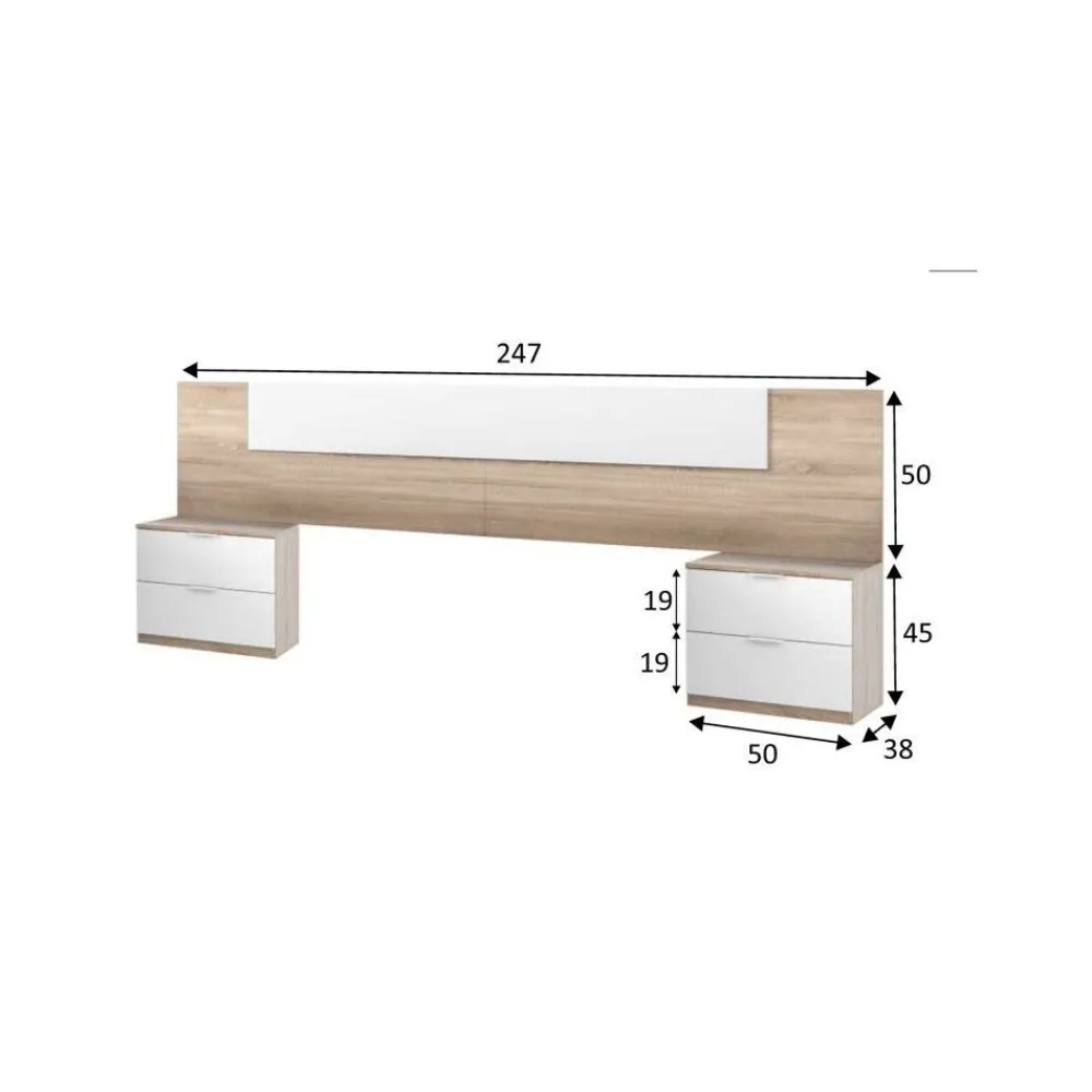 - Cabecero con mesitas: 247 cm (ancho) x 95 cm (alto) x 35 cm (fondo)