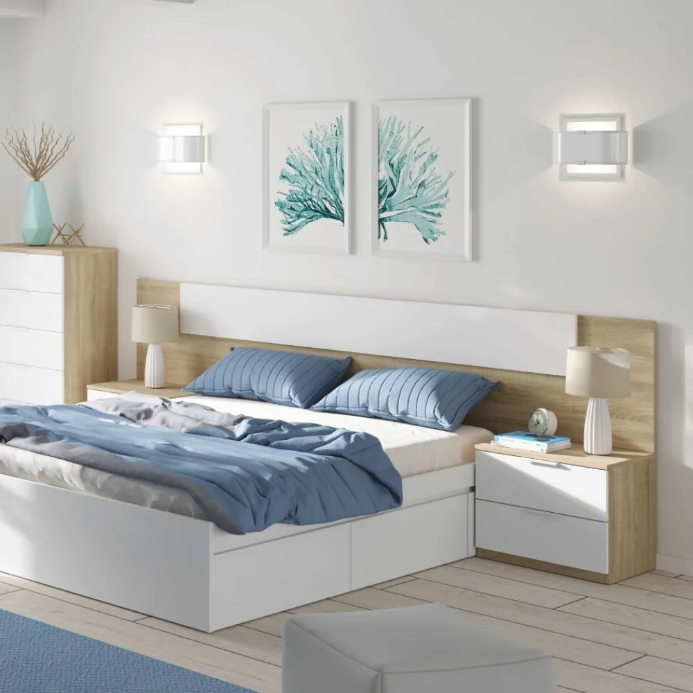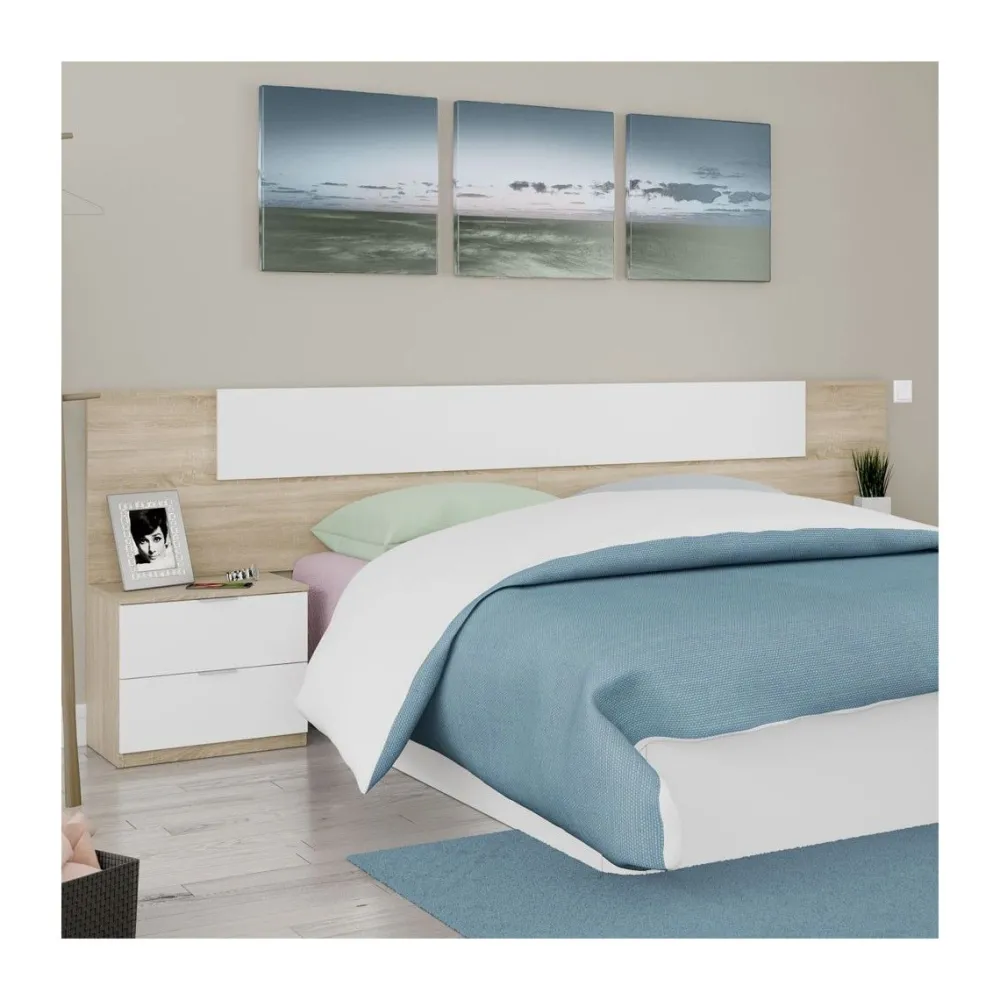 El dormitorio Alaya está compuesto por un cabecero colgante y dos mesitas en color de estilo nórdico, roble Canadian y blanco Artik.