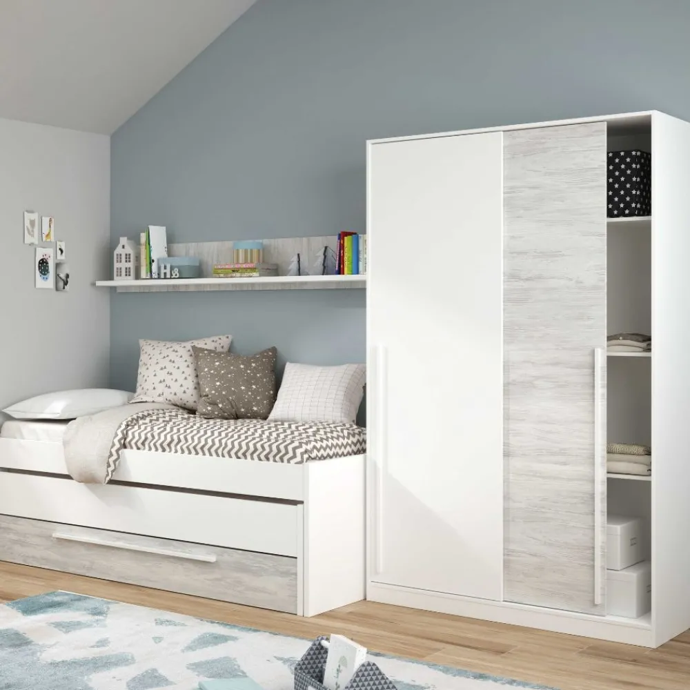 Renueva la habitación de los más jóvenes con el pack dormitorio juvenil Elliot en acabado Blanco Artik – Velho. Una solución integral que incluye una cama nido con cajón inferior y estante a juego, junto con un espacioso armario de puertas correderas diseñado para optimizar el espacio al máximo.