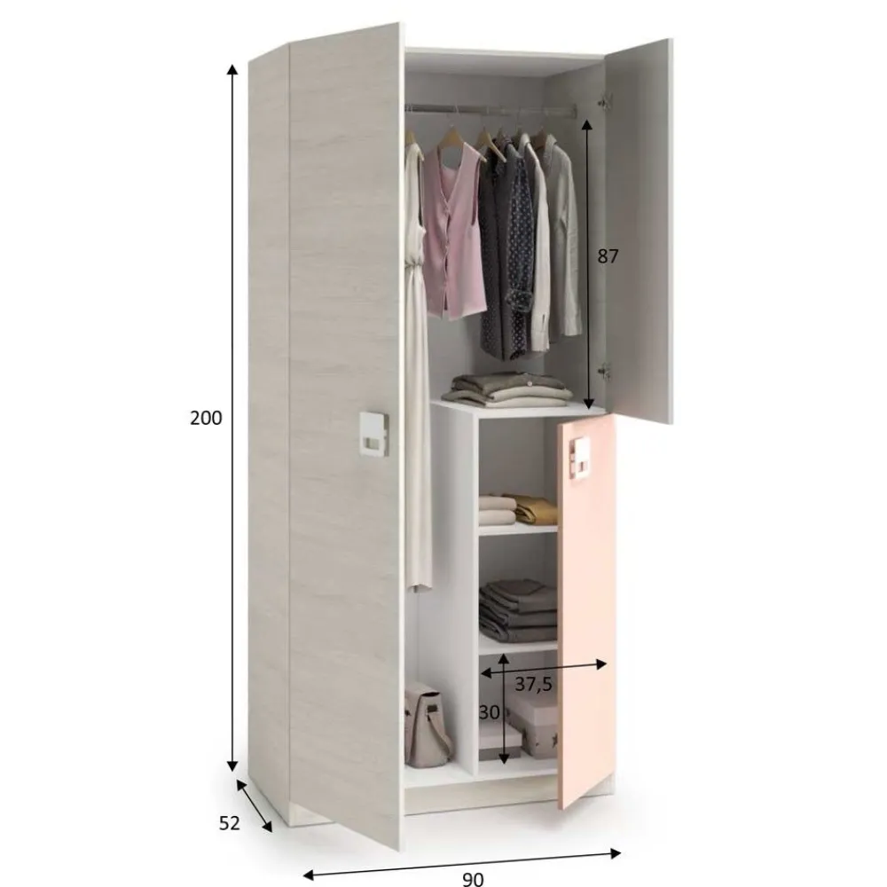 El armario juvenil New Nube nos permite crear un espacio práctico y moderno en la habitación de tus hijos. Este armario juvenil dispone de tres puertas, una grande y dos más pequeñas, y está disponible en un elegante acabado de color blanco Alpes, rosa y gris. El interior del armario se distribuye con una barra superior para colgar la ropa en la parte superior y tres estantes para dejar la ropa doblada, lo que permite un almacenamiento eficiente y organizado