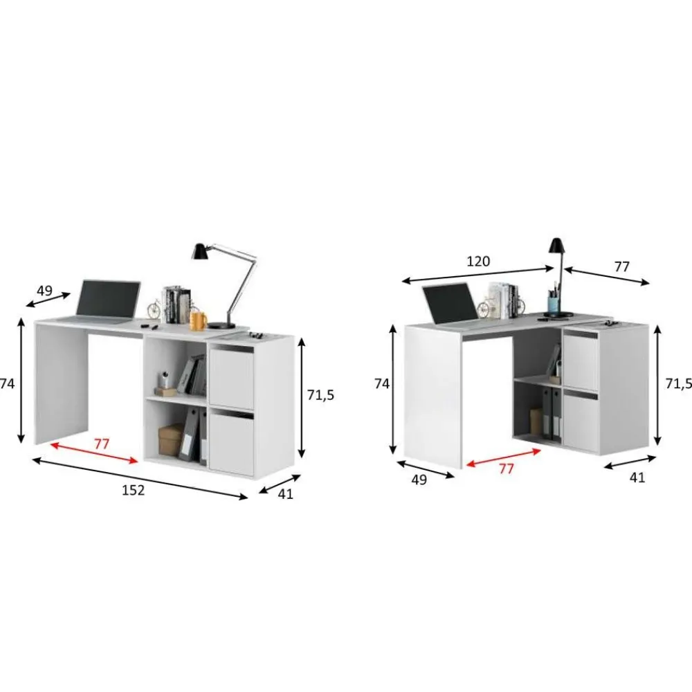 Escritorio angular o escritorio recto con un buc con dos puertas y dos huecos, sea cual sea la opción de montaje que elijas, es reversible, es decir que se puede montar a izquierda o derecha el armario.