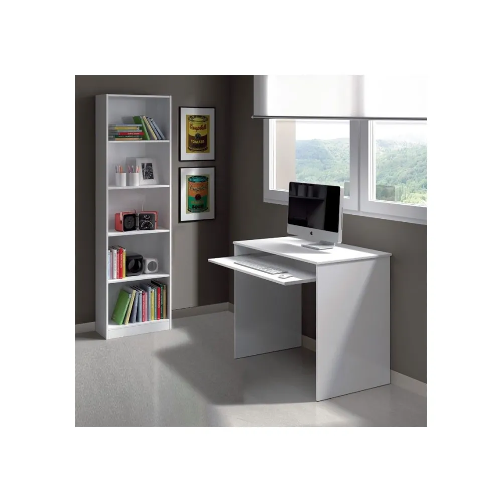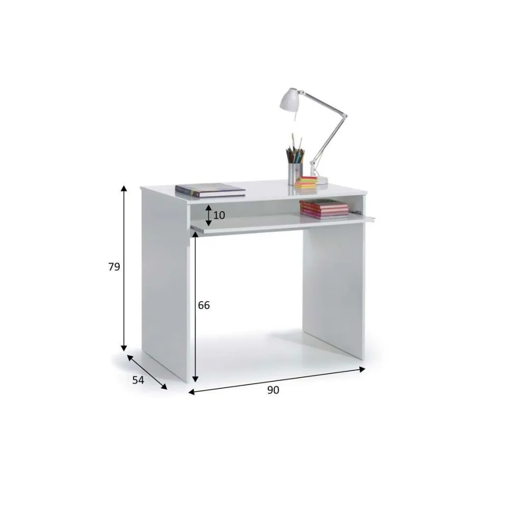 Una mesa de estudio o escritorio para colocar el ordenador en color blanco, dispone de una bandeja extraíble para colocar el teclado o ratón y trabajar cómodamente.