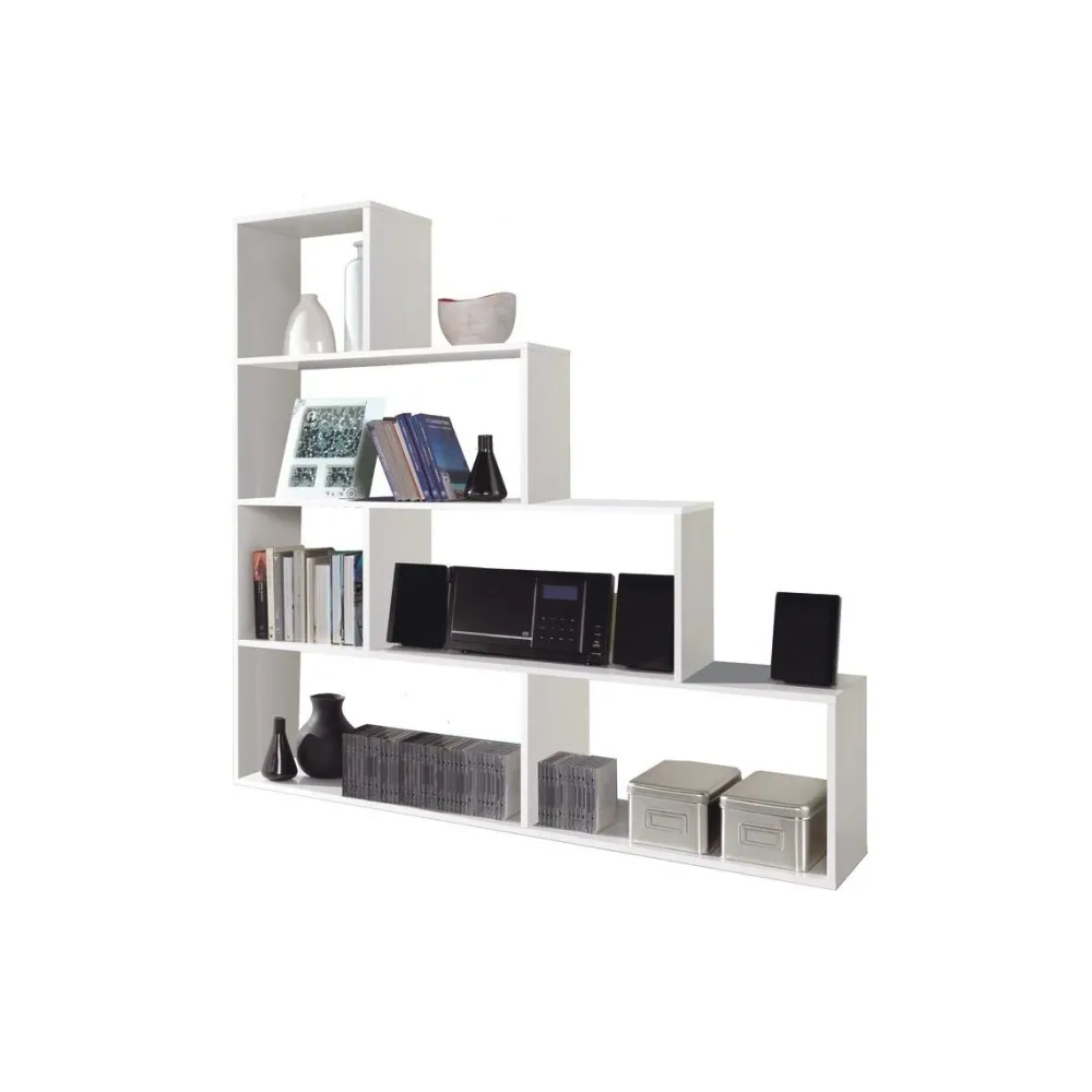 La estantería, librería Klum en color blanco brillo, es una estantería en forma de escalera, con 6 huecos asimétricos. Puede utilizarse tanto de estantería de pared como de separador de ambientes tanto en un salón como en una habitación.