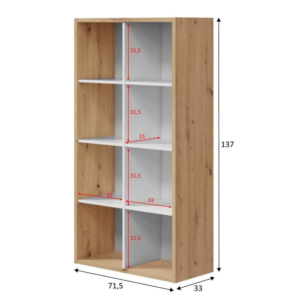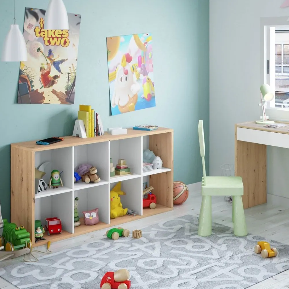 Bonita estantería juvenil en color Roble Nodi y con trasera en color blanco. Huecos de 31.5 x 31 cm para colocar libros, juguetes u objetos decorativos.