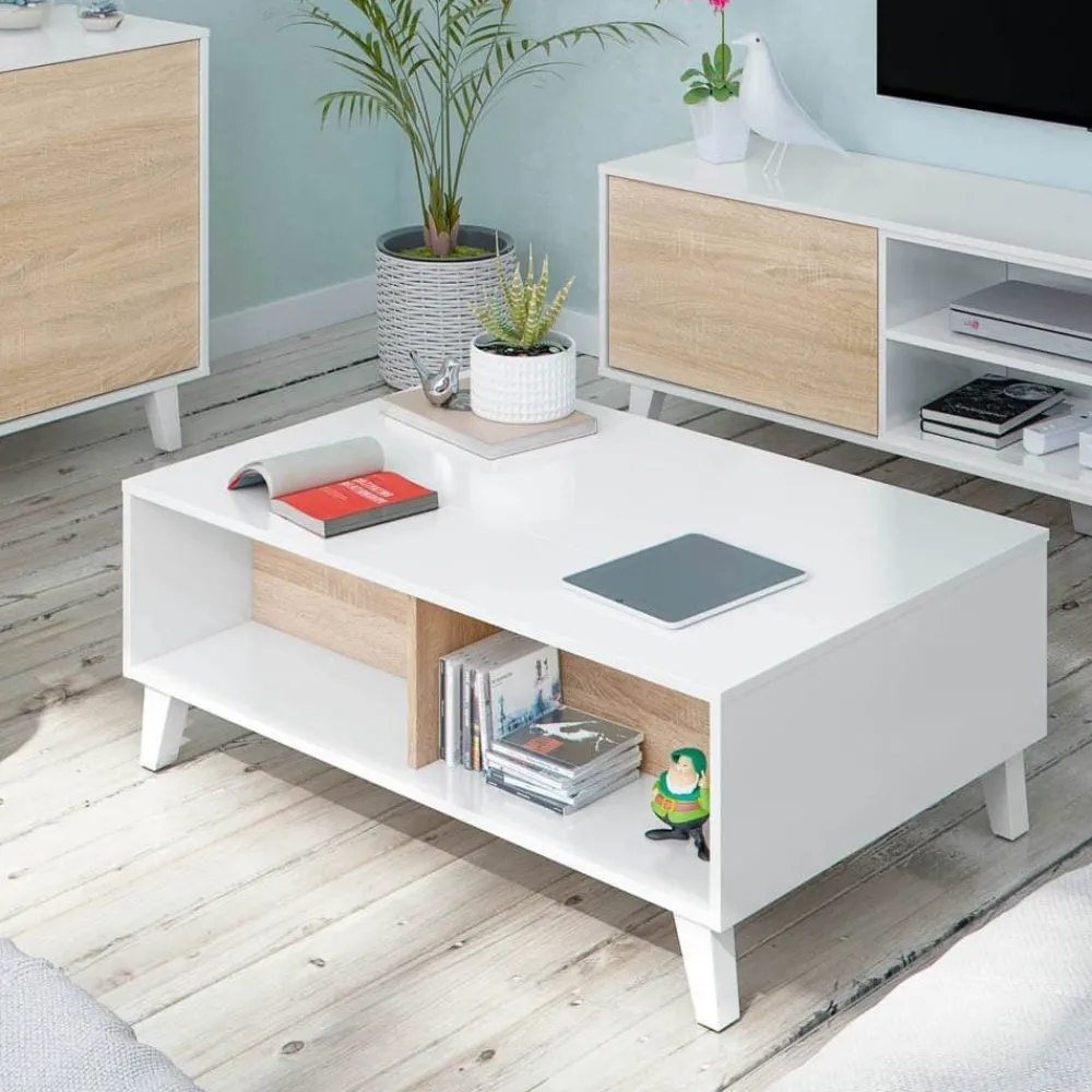 La mesa centro elevable Zaiken Plus, en acabado blanco brillo combinado con roble Canadian, es perfecta para combinar con salones de diseño nórdico.