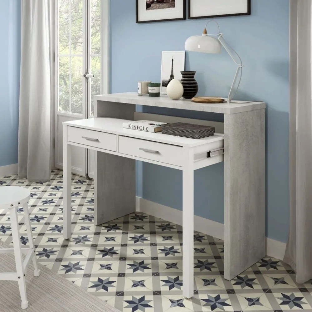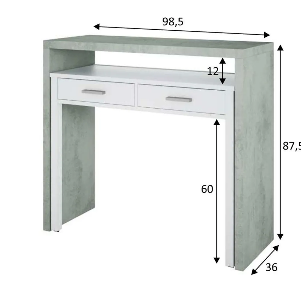 Mesa consola extensible que se convierte en un práctico escritorio. Estructura en color cemento y escritorio en blanco Artik. Cuenta con dos amplios cajones para guardar todo el material que necesites.