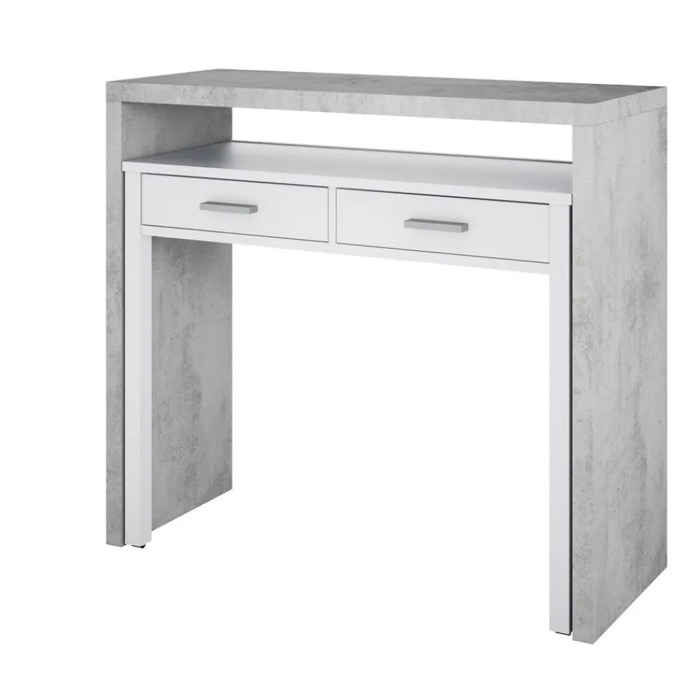 Mesa consola auxiliar extensible con 2 cajones. Un mueble multifunción para colocar como recibidor o utilizar como escritorio. En color blanco Artik combinado con cemento.