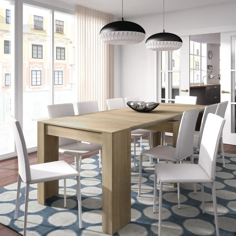 Descubre las posibilidades que te ofrece la en un elegante acabado color roble Canadian. Esta mesa extensible se adapta a tus necesidades, transformándose desde un mueble recibidor compacto a una gran mesa de comedor extensible según lo requiera la situación.