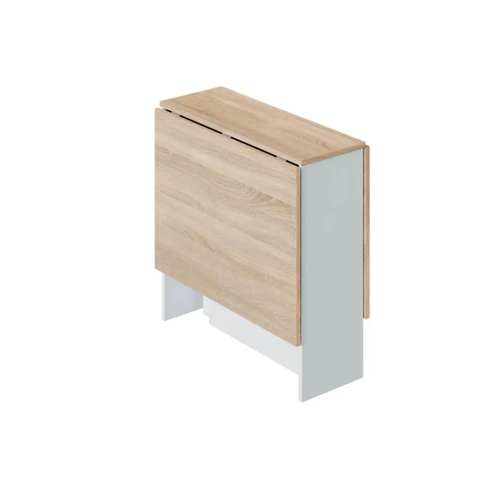 Una mesa de cocina abatible, que no ocupa apenas espacio cuando está cerrada. Dispone de dos alas abatibles que se pueden abrir individualmente o en conjunto según nuestras necesidades, con un bonito acabado de estilo nórdico en color blanco Artik y roble Canadian, es una opción idónea para tu cocina o como mesa auxiliar en cualquier rincón de la casa.