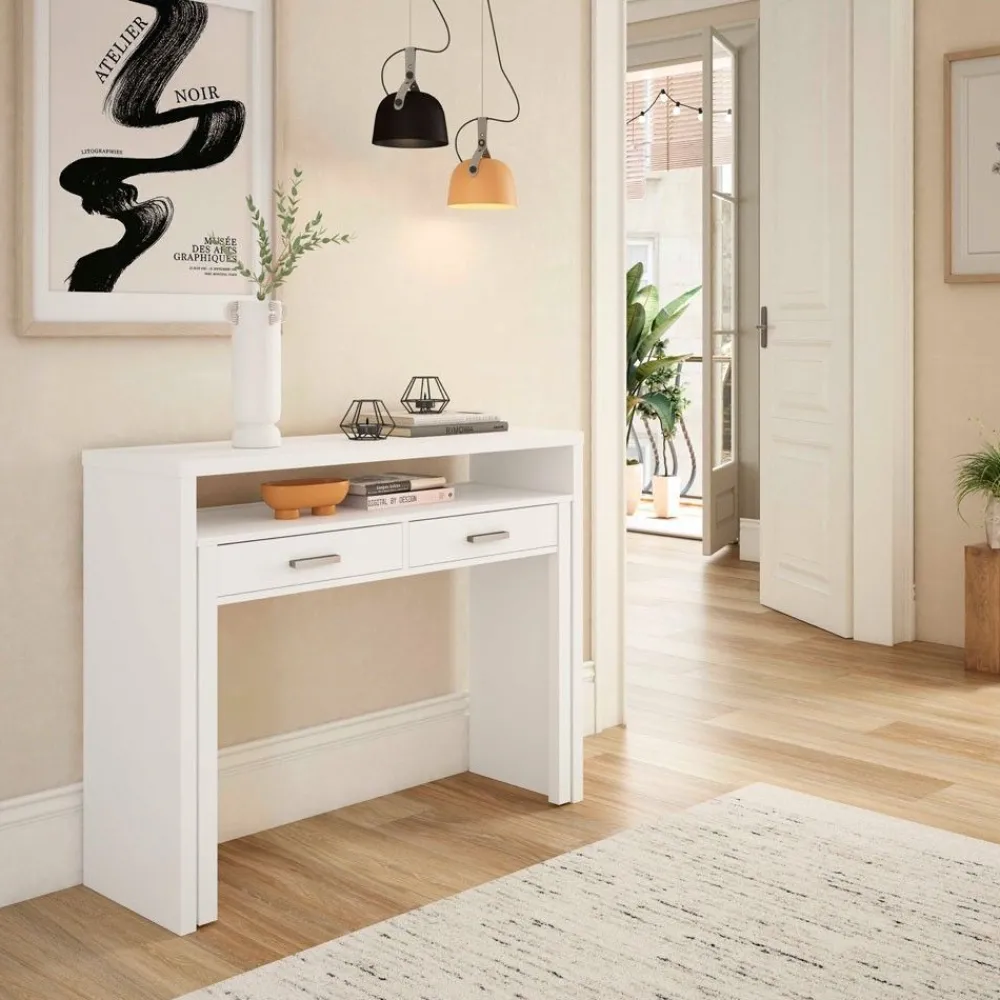 Escritorio, recibidor y mesa consola extensible en una sola pieza, la mejor forma de ahorrar a la hora de comprar tus muebles es elegir diseños creativos y que se puedan utilizar de varias maneras.