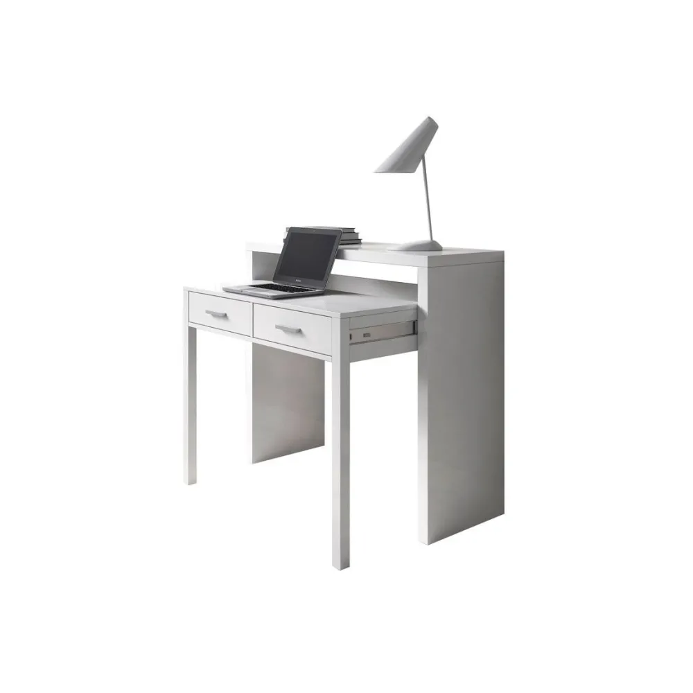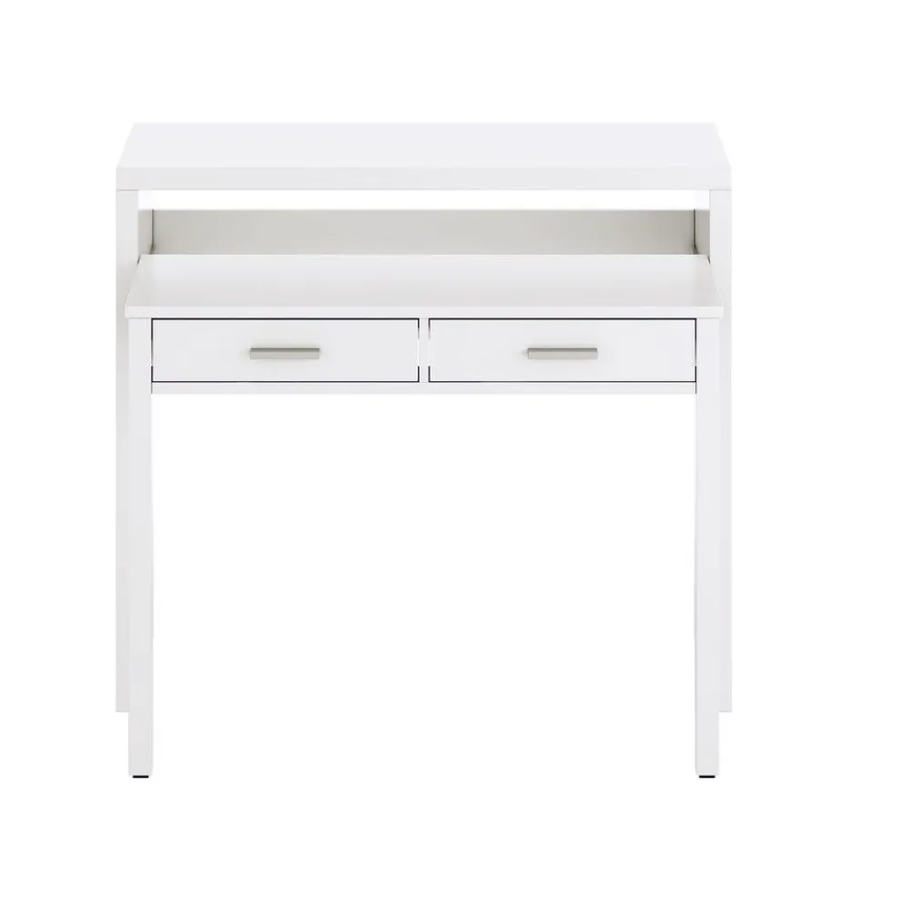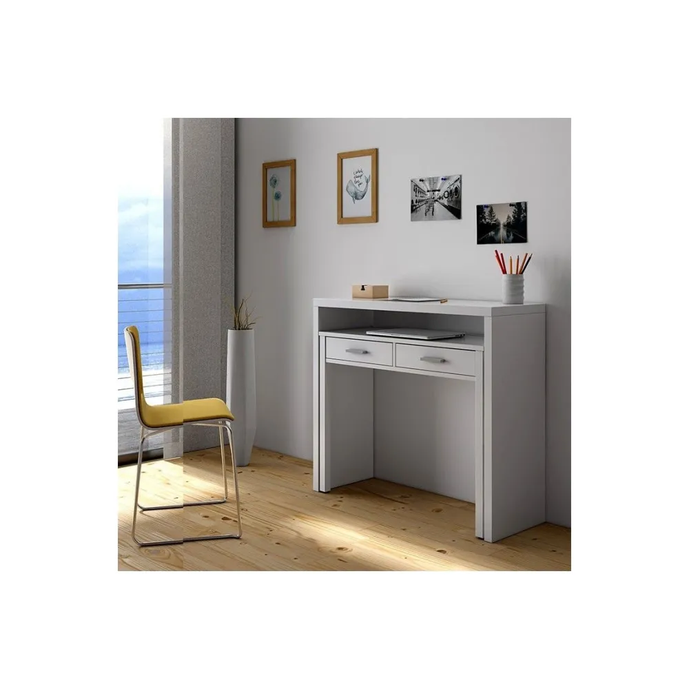 Cerrado es una bonita consola con dos cajones, pero si lo abres se convierte en un práctico y funcional escritorio. Tú decides como lo utilizas. En color blanco Artik para que combine con tu decoración