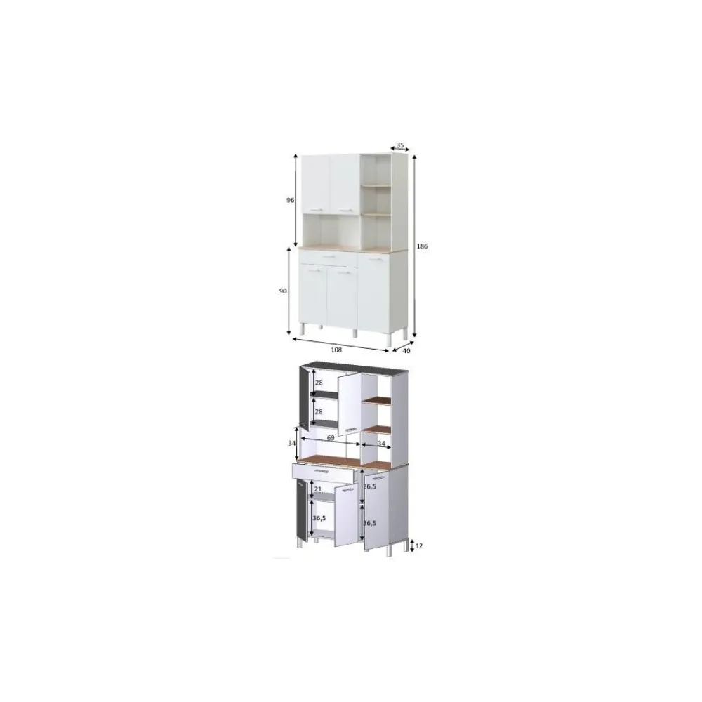 Una columna alta con gran capacidad de almacenamiento, con una encimera que separa la parte alta y la baja en color roble Canadian y que te servirá de apoyo. La capacidad de este armario es inmensa puedes guardar la vajilla, comida o cualquier cosa que necesites. Cuenta también con útil cajón que podemos usar como cubertero. Pero la característica principal de este armario de cocina es que dispone de un hueco para colocar el microondas.