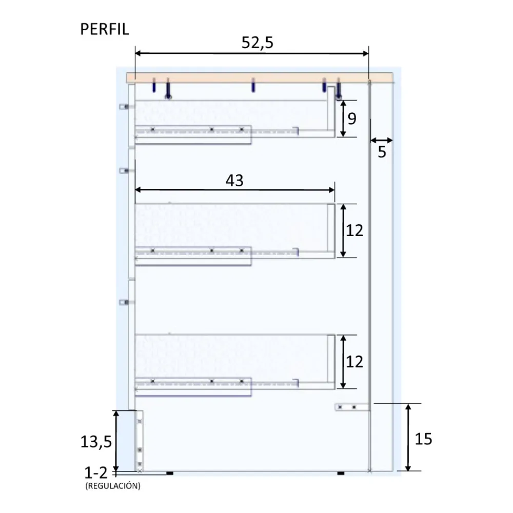 - Capacidad de los cajones inferiores: 55 cm (ancho) x 12 cm (alto) x 43 cm (fondo).