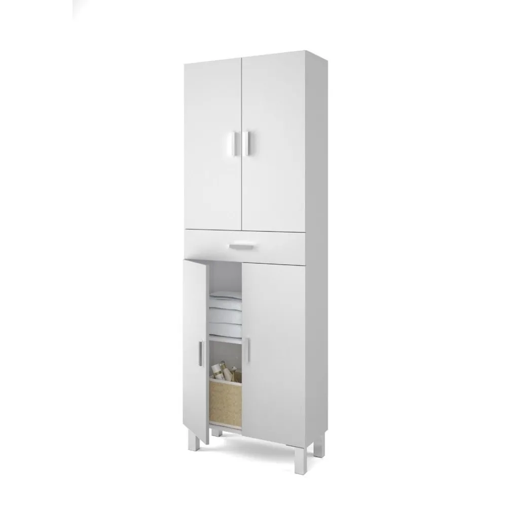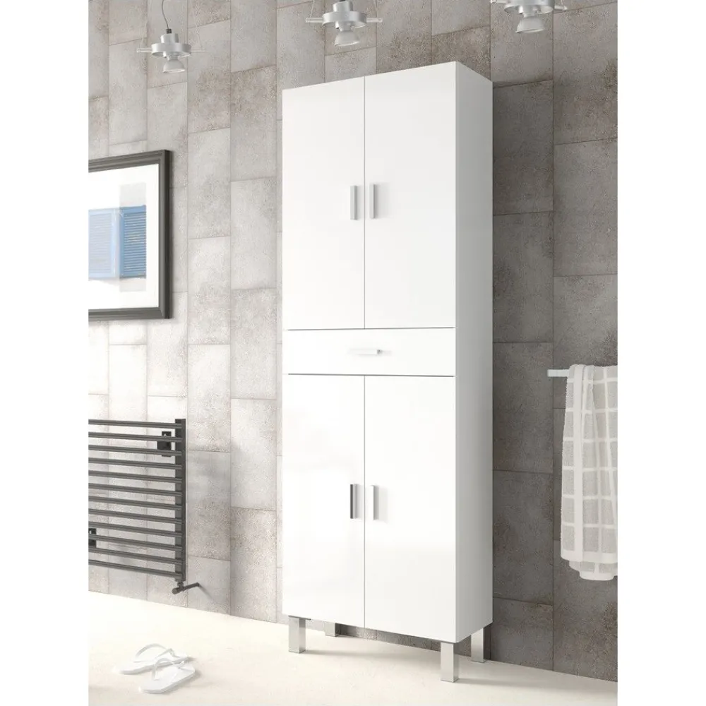 Columna de baño en color blanco brillo, con cuatro puertas y un cajón. Perfecta para aumentar la capacidad de almacenamiento de cualquier aseo.