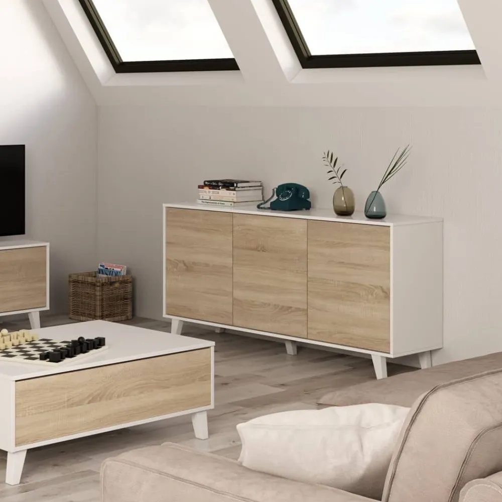 El aparador buffet Zaiken Plus de diseño inspirado en el estilo nórdico, por su estructura en acabado blanco brillo y sus tres puertas en color roble Canadian. Aumenta la capacidad de almacenamiento de tu salón, ya dispones de 6 amplios huecos en los que puedes almacenar la vajilla o los objetos de menaje y tenerlos siempre a mano en el comedor. Otro punto a destacar es sus patas inclinadas que le aportan un aire vintage y que además facilitan las labores de limpieza del suelo.