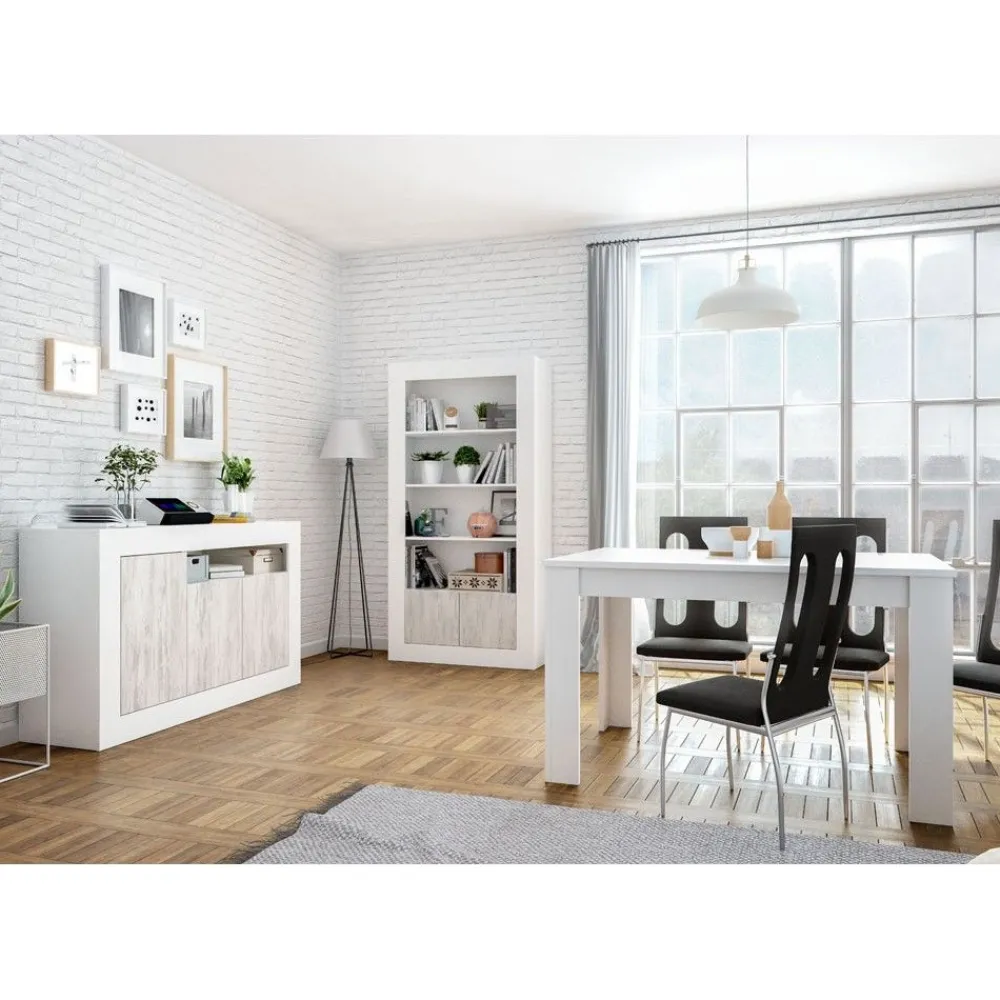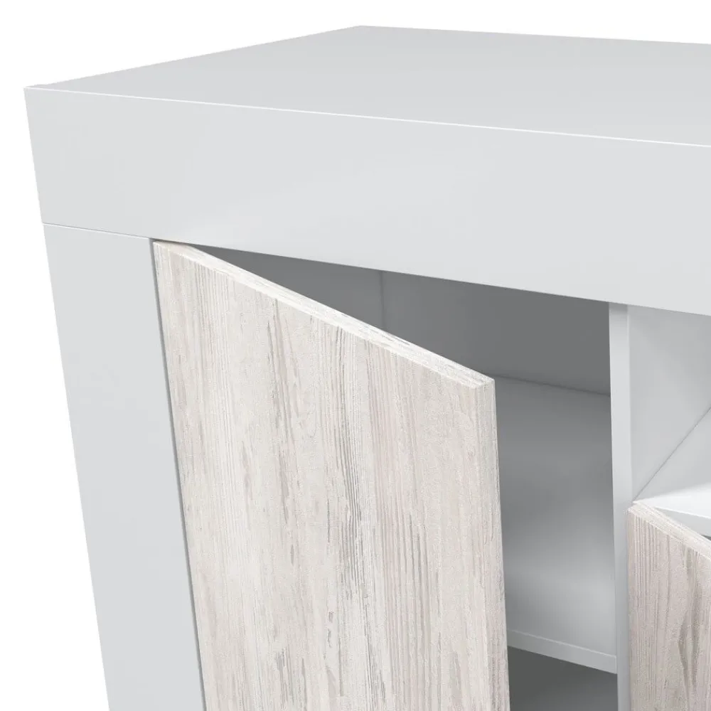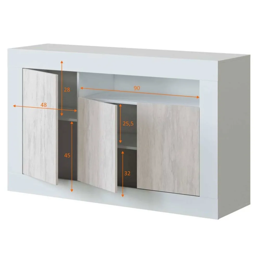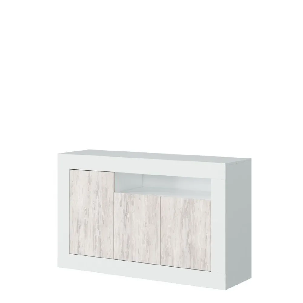 Aparador de estructura atamborada con tres puertas y un hueco. Se presenta en color blanco Artik combinado con blanco Velho.