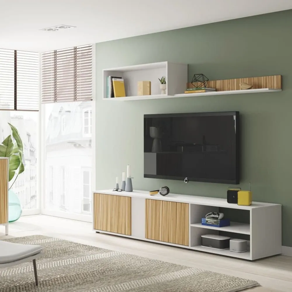 Mueble de salón compacto, compuesto de un mueble de televisión de 2 puertas, un módulo superior sin puertas y un estante de colgar.