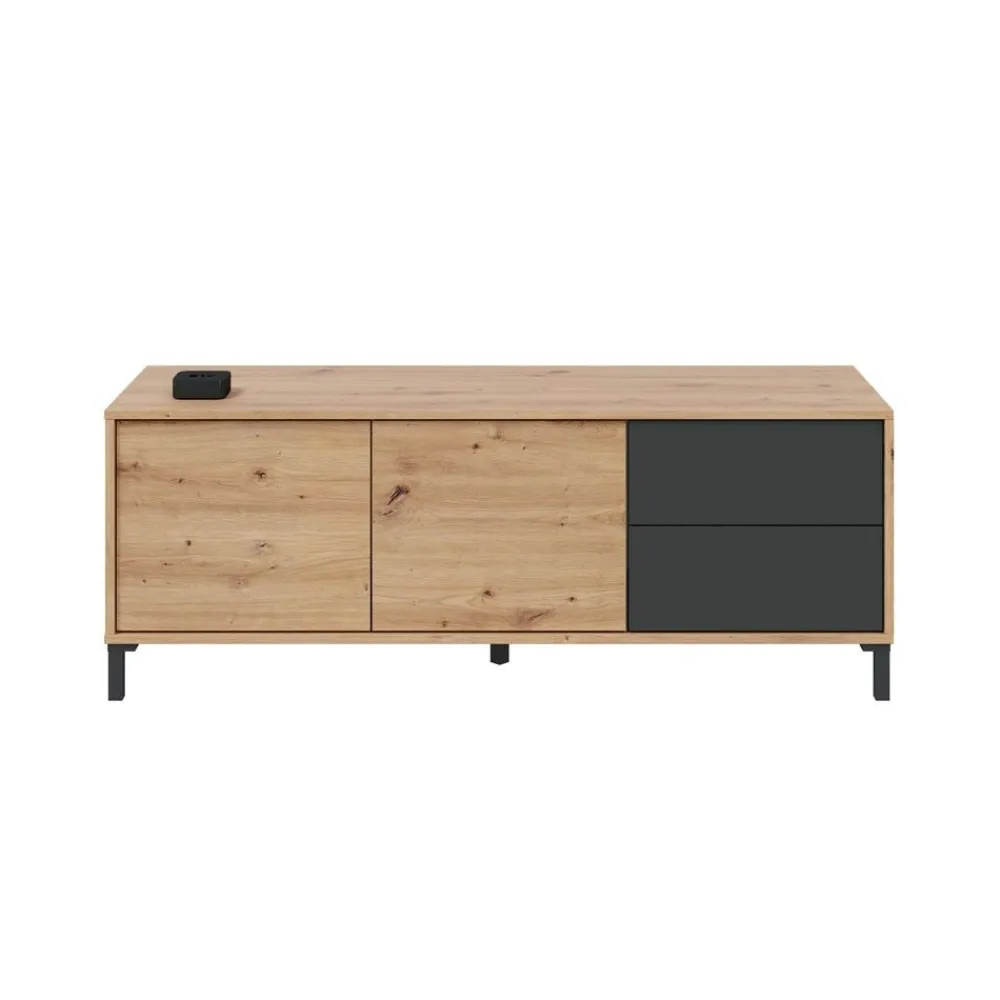 Mueble para televisión en acabado roble Nodi, combinado con frentes de cajón en color Antracita. Dispone de patas en color negro para levantarlo un poco más del suelo.
