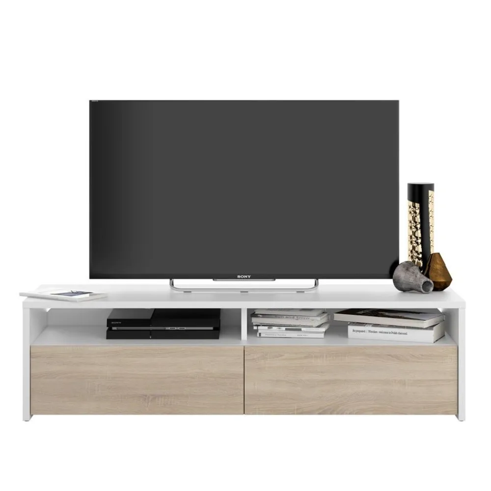Un mueble para TV con un diseño en líneas rectas con estética nórdica por su acabado en color blanco Artik y roble Canadian, colores que ya son tendencia en 2020. De tamaño reducido nos permite colocarlo en cualquier habitación y con amplia superficie para que puedas colocar incluso pantallas de grandes pulgadas. Dispone de dos puertas batientes y dos huecos multimedia.