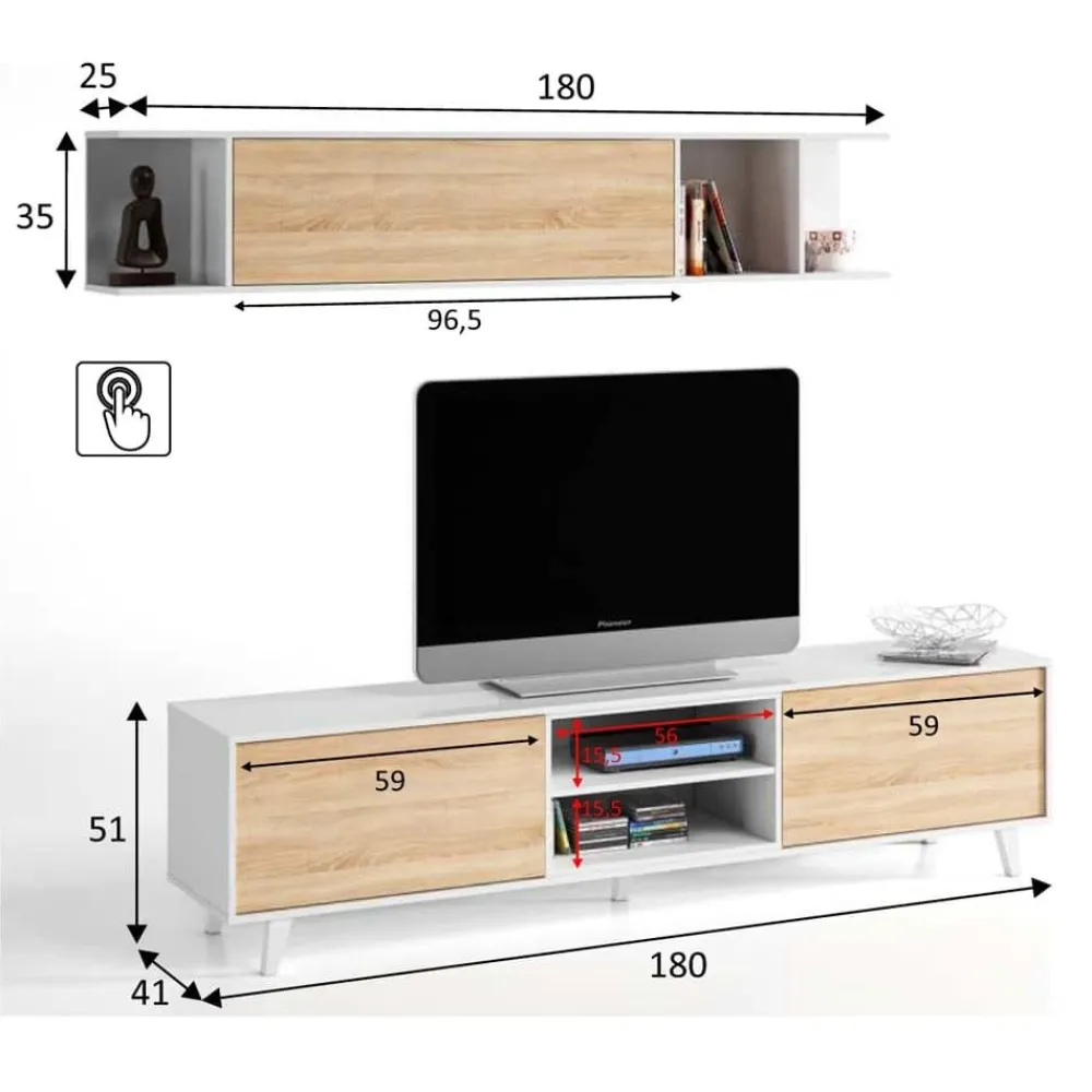 Con un acabado en color roble Canadian combinado con blanco brillo, dispone de 2 huecos en el módulo bajo para que podamos mantener el orden de nuestros aparatos multimedia.
