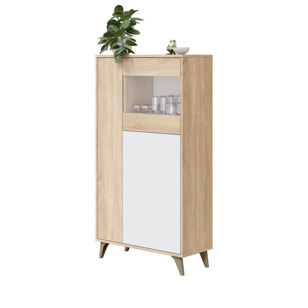 Mueble aparador alto de tres puertas, una de ellas vitrina, destaca por su cuidado diseño de estilo nórdico que combina los colores roble Canadian y Blanco. Su sistema de apertura tipo push, nos permite prescindir de los tiradores.