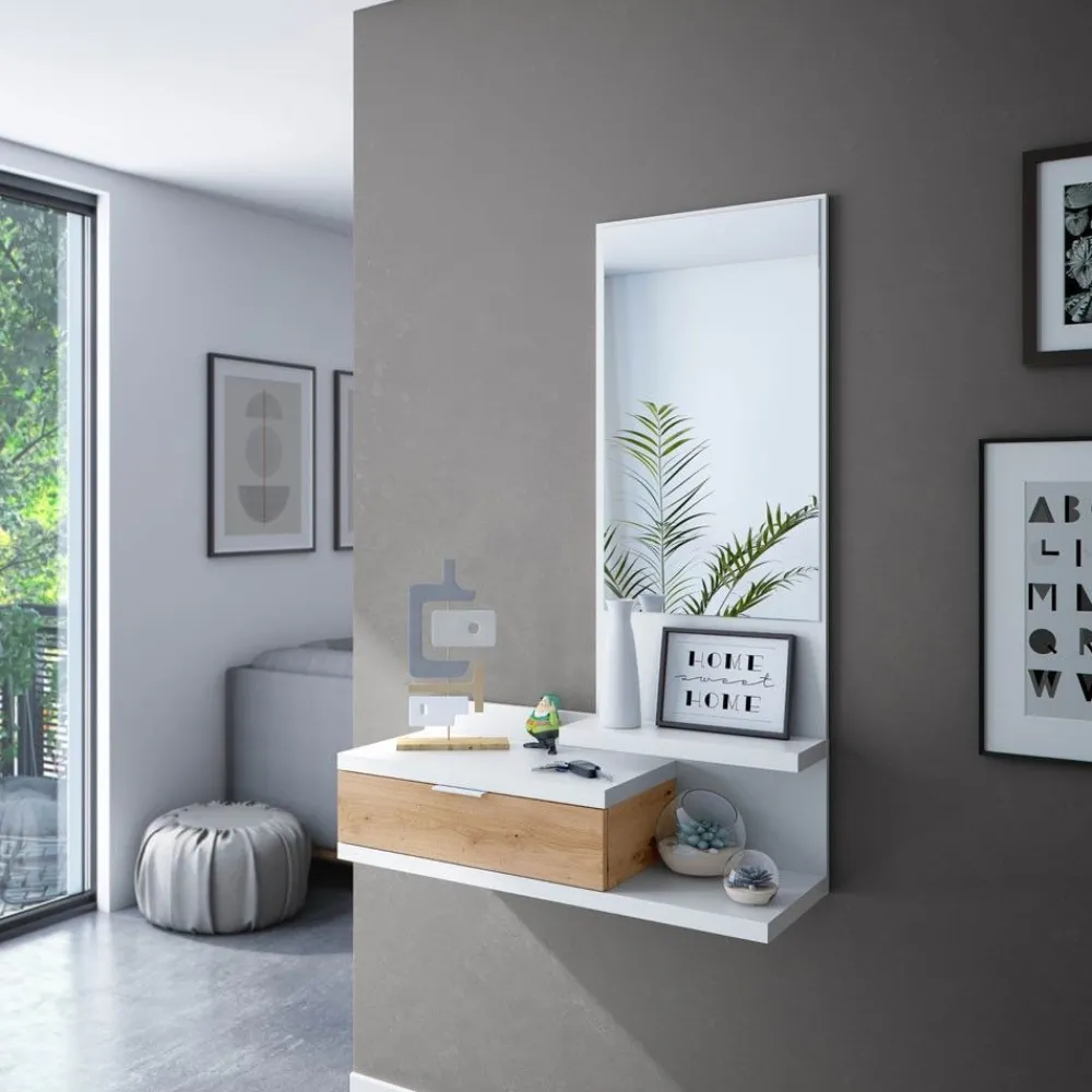Elegante recibidor, compuesto por una consola con un cajón y hueco, perfecta para dejar las llaves al entrar en casa, y un espejo vertical. Se presenta en un bonito acabado en blanco Artik y roble Nodi.