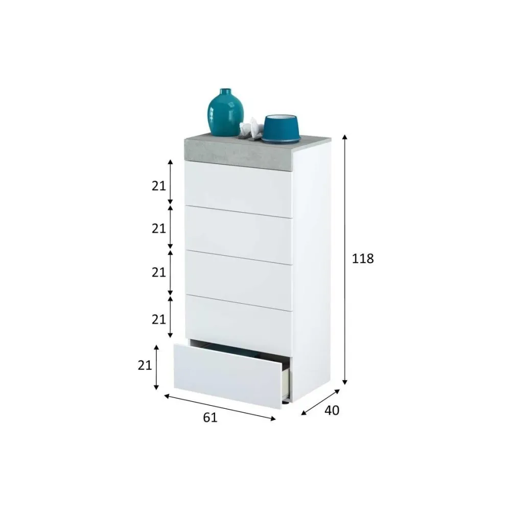 El sinfonier blanco Artik Tekkan combinado con cemento es una cajonera de cinco cajones para dormitorio, con tiradores ocultos e interior de los cajones en textil.