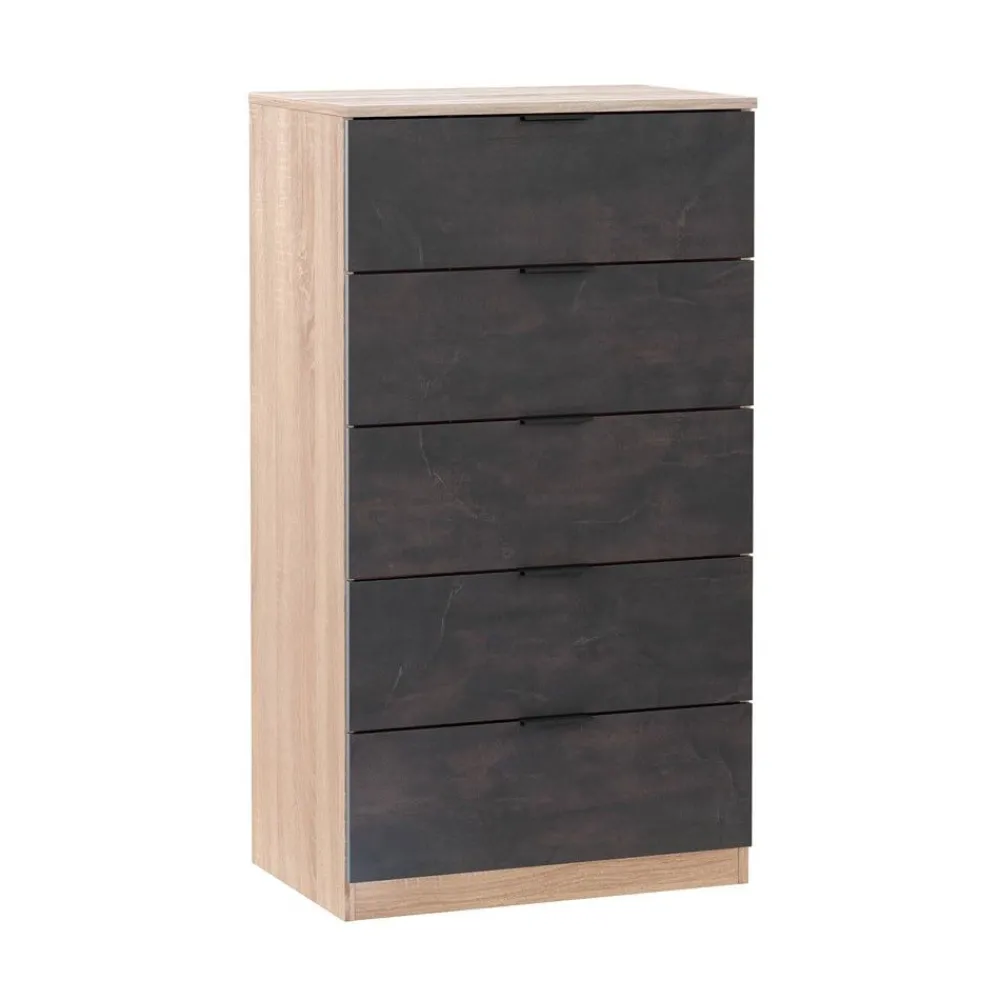 Para completar el cabecero con dos mesitas de estilo industrial Alaya, nada mejor que este mueble de cinco cajones en color roble Canadian con los frentes de cajón en óxido.