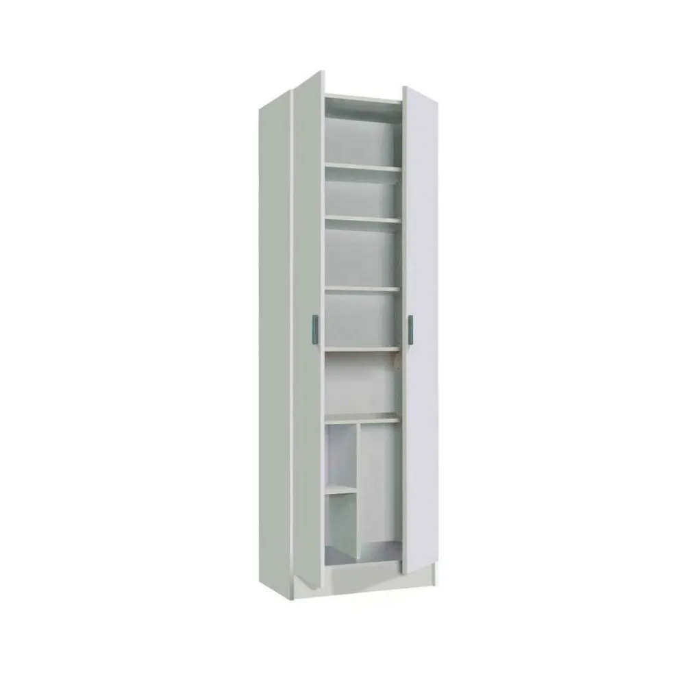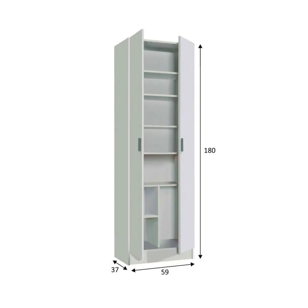 Su interior cuenta con cinco estantes regulables en altura, su especial distribución lo hace perfecto tanto como armario multiusos de dos puertas o como mueble zapatero con compartimento incluso para botas.