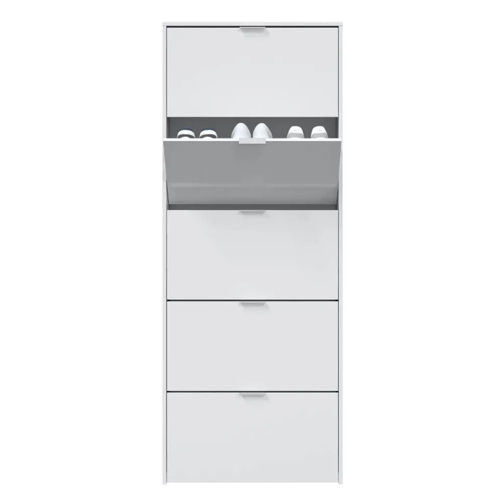 Armario zapatero con poco fondo, en color blanco, con cinco puertas batientes, nos permite guardar hasta 15 pares de zapatos.