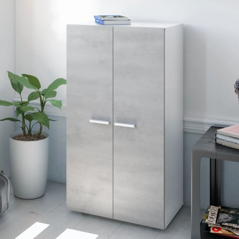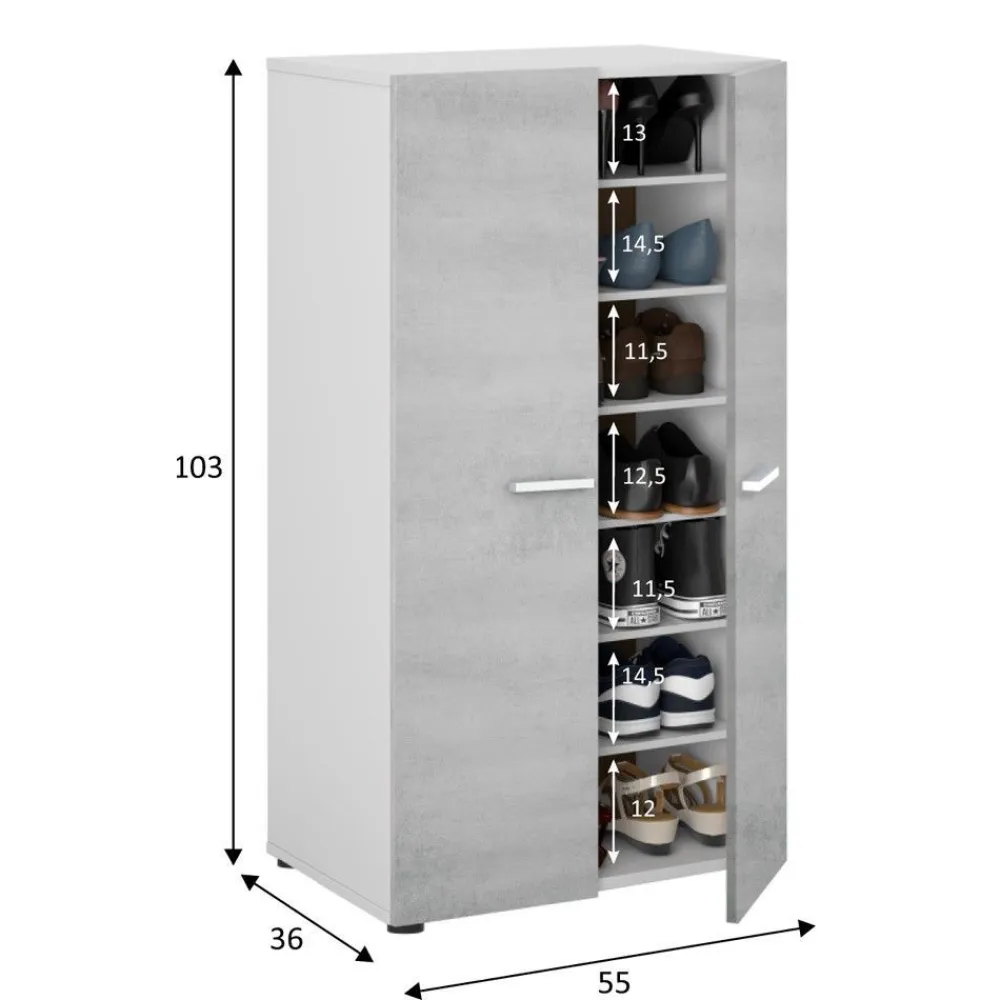 Armario zapatero de dos puertas, con 6 estantes interiores regulables en altura, gran capacidad de almacenamiento en el que podemos acomodar hasta 21 pares de zapatos. En color blanco y cemento para estar siempre a la moda.