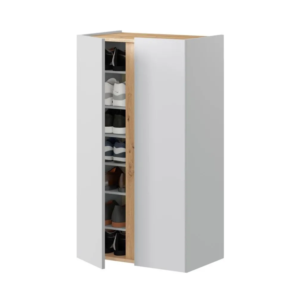 Mueble zapatero de diseño moderno en color blanco Artik combinado con roble Nodi. Dispone de 6 estantes regulables en altura.