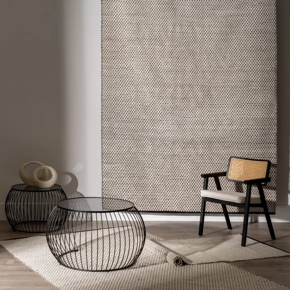 La combina la elegancia del diseño monocromático con la calidad de los materiales naturales. Fabricada con un 60% de lana, 30% de algodón y 10% de PET, esta alfombra añade textura y calidez a cualquier habitación.