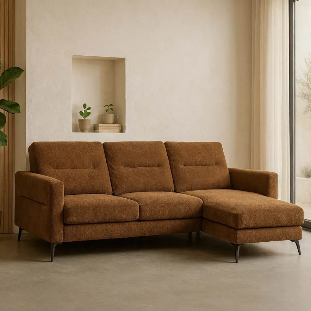 Material: tejido(100% poliéster). Estructura: madera de eucalipto. Relleno: PU foam, densidad 25. Altura asiento: 46cm. Ancho asiento: 210cm. Profundidad asiento: 55cm/125cm. Altura respaldo: 50cm. Altura reposabrazos: 20cm. Altura patas: 15cm. 2 bultos de 150x86x87,5cm y 86x157x87,5cm. Peso máximo sorportado: 350kg. Cumple la normativa EN12520 (uso doméstico).